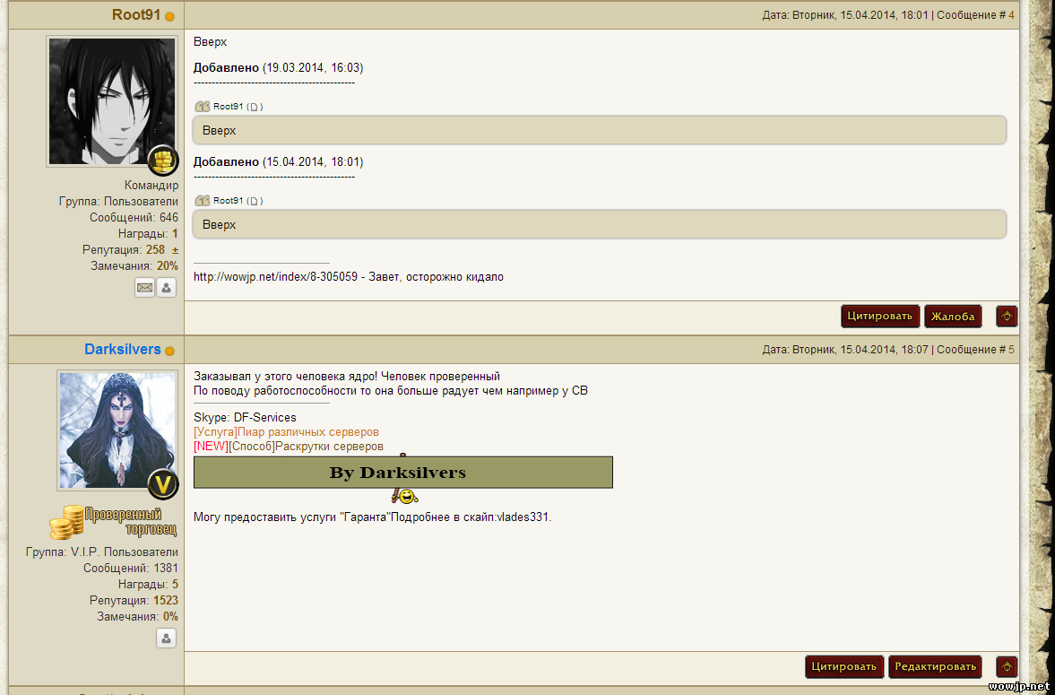 Наглости у человека хоть отбавляй, открыто заявляет о отсутствие поддержки, дак еще и торгует чужой работой. Ревезия довольно старая, что февральская вроде(более новой нет не у кого), можете спокойно покупать актуальных крашей насчитал 2, 3, и 1 фриз Ах да, лол , выклянчивол как то исходники, просился в разрабы Добавлено (30.06.2014, 21:31) Лож, со скайпа удалил данного товарища, ибо раздражал своими глупыми вопросами, возможно купил через Смауга, а там кривая база, однако покупайте :P Добавлено (30.06.2014, 21:35) 1.SergeySV(Спасибо SergeySV за сборку) 2.GameCore(Спасибо Root91 за качественную сборку.) 3.MythProject(Прости,не знаю кто создатель.Не помню просто.) 4.MythCore(Прости,не знаю кто создатель.Не помню просто.) 5.GovnoCore(Прости,не знаю кто создатель.Не помню просто.) 6.Ecl2(Прости,не знаю кто создатель.Не помню просто.) Пройдемся: Сергей СВ это Сергей СВ(Паблик лучше привата работает) о 2 сборке я уже написал MythProject это MythProject (Сорцы валяются в паблике, и их обновляют) GovnoCore создал человек с icq как у тс, название говорит за себя Ecl2 1 раз вижу ALL RANDOMCORE (наверное взятое ядро СВ + свои наработки), но явно не стоит даже 200 рублей Прости, мальчик, за что ты хочешь 500 рублей?