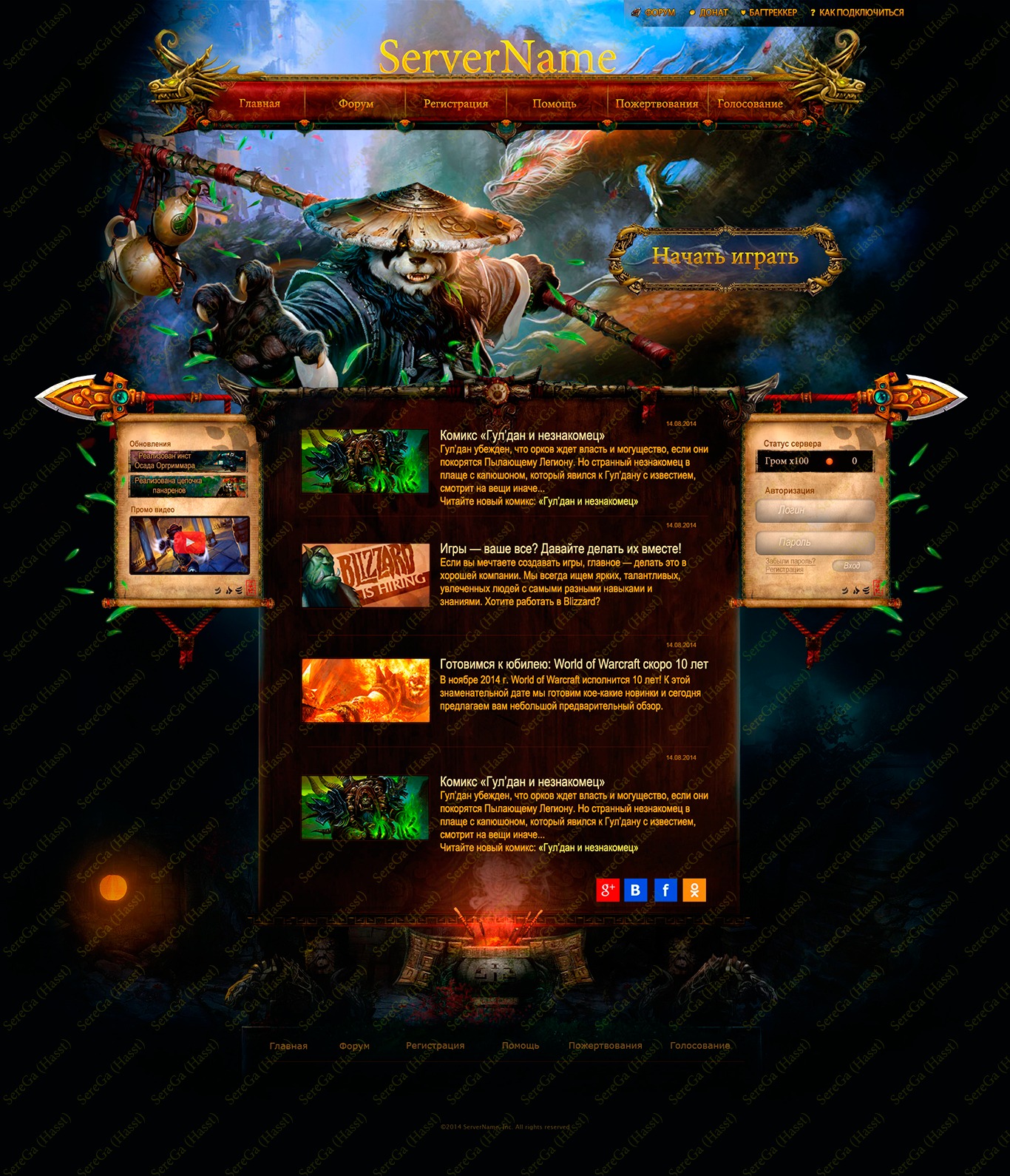 Сделан из кусков других сайтов. Кнопка "начать играть" Просто ужасна! Да и в целом смотрится не очень. Не понимаю одного, зачем выкладывать много скринов? И зачем растягивать контент? Контент должен быть на месте, а вон растягивай сколько угодно.